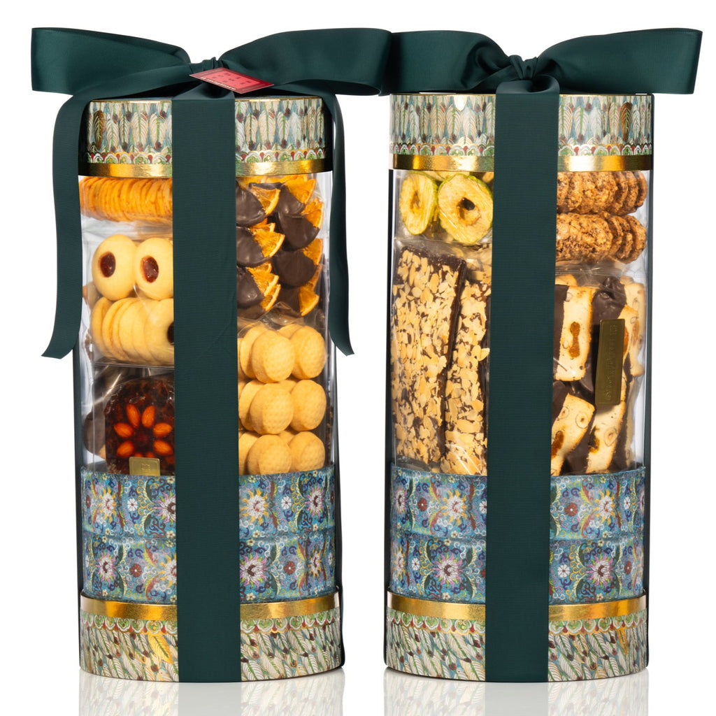 Presented as an open style hamper in a beautifully patterned hatbox with Champagne foil highlights and a Christmas green grosgrain ribbon.