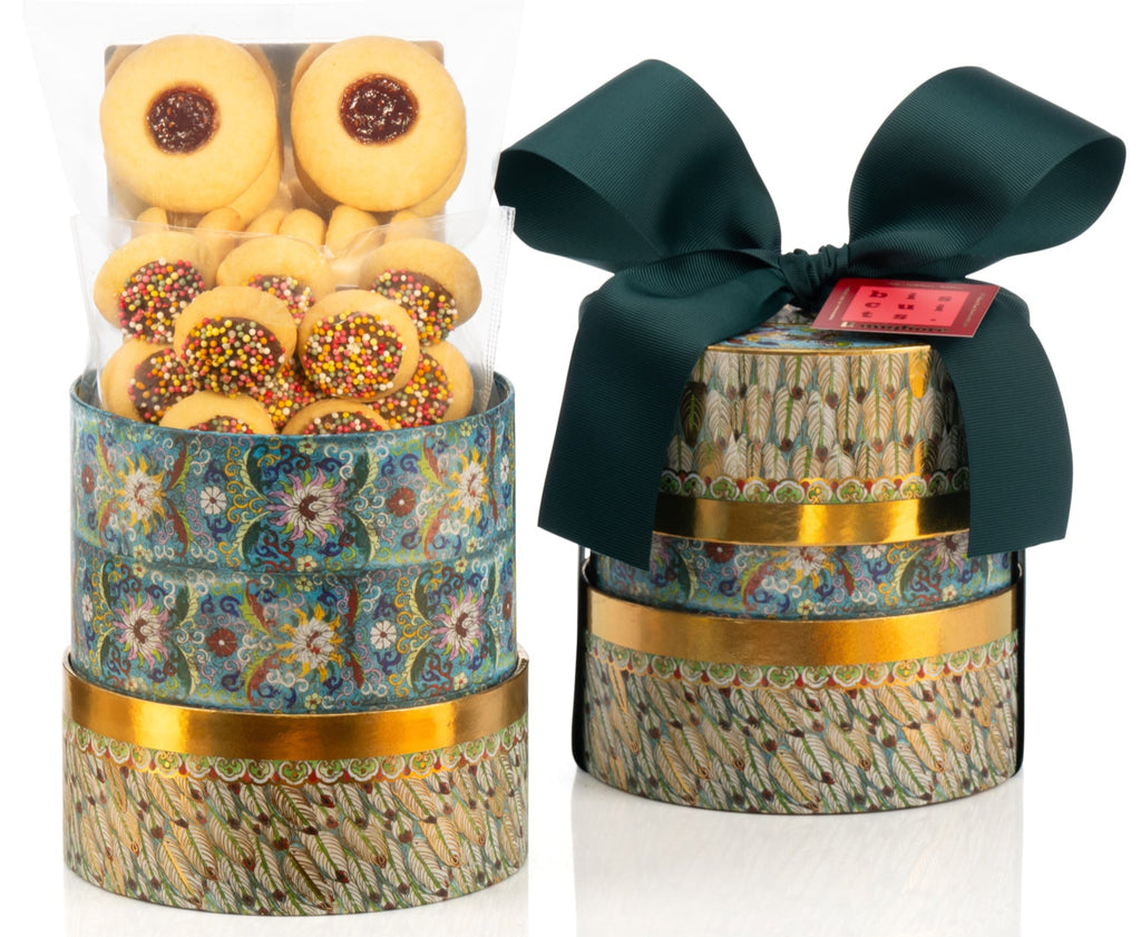 Two of our very popular handmade buttery shortbreads packaged in a beautiful patterned little hatbox with champagne foil highlights, sealed with a very Christmas green grosgrain ribbon.