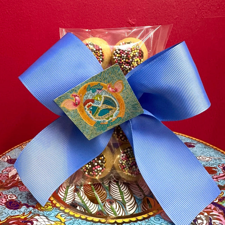 Piccolini Bambini, delicious handmade buttery shortbreads topped with Chocolate Freckles. Packed in a cute stack with Mini Milk Chocolate Easter Eggs
